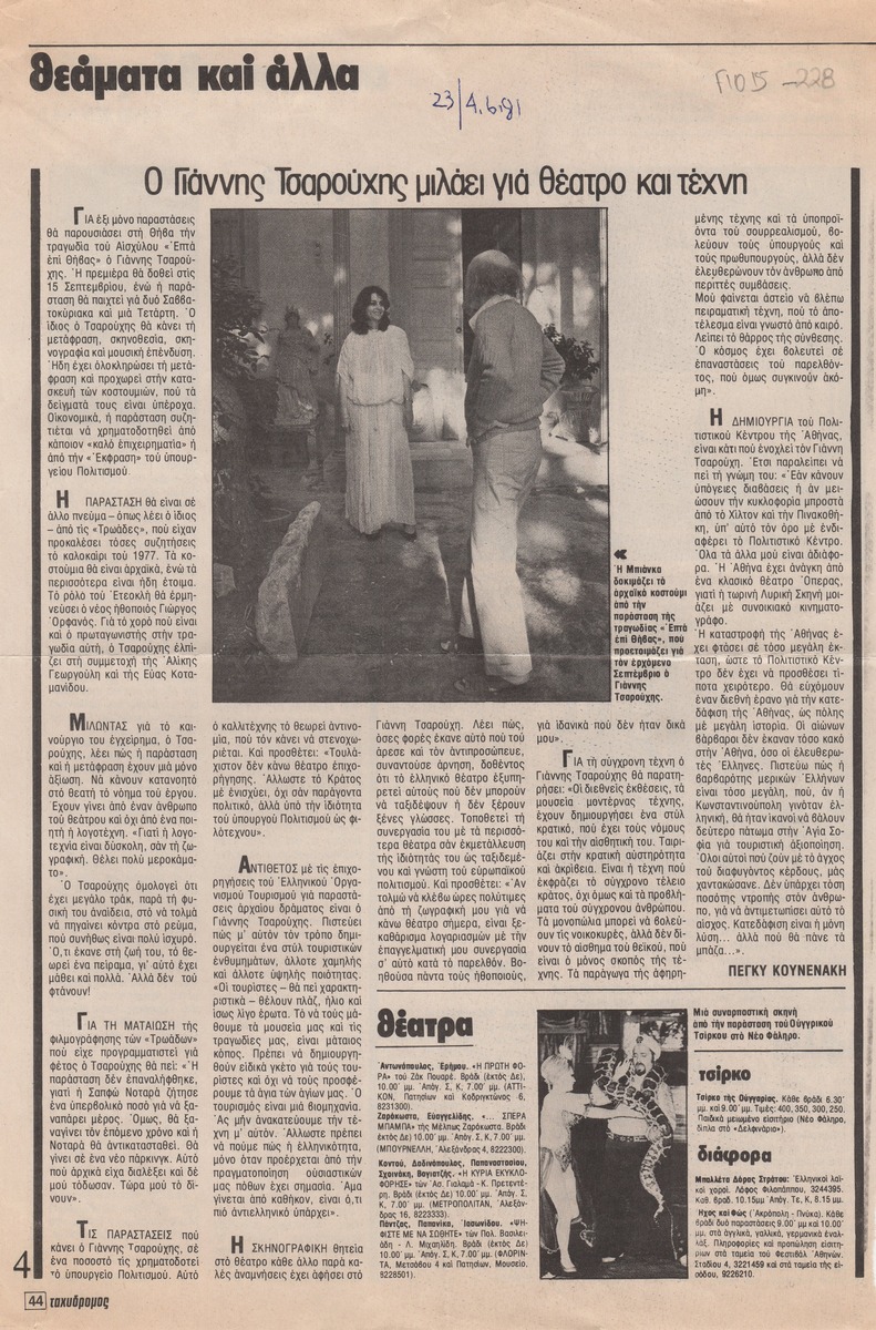 A clipping from the magazine “O Taxydromos” issue 23, dated June 04, 1981, featuring an article about the staging of the tragedy Aeschylus’ ‘seven on Thebes’ by Yannis Tsarouchis in Thebes. The article relates the artist’s views on Greek theater.