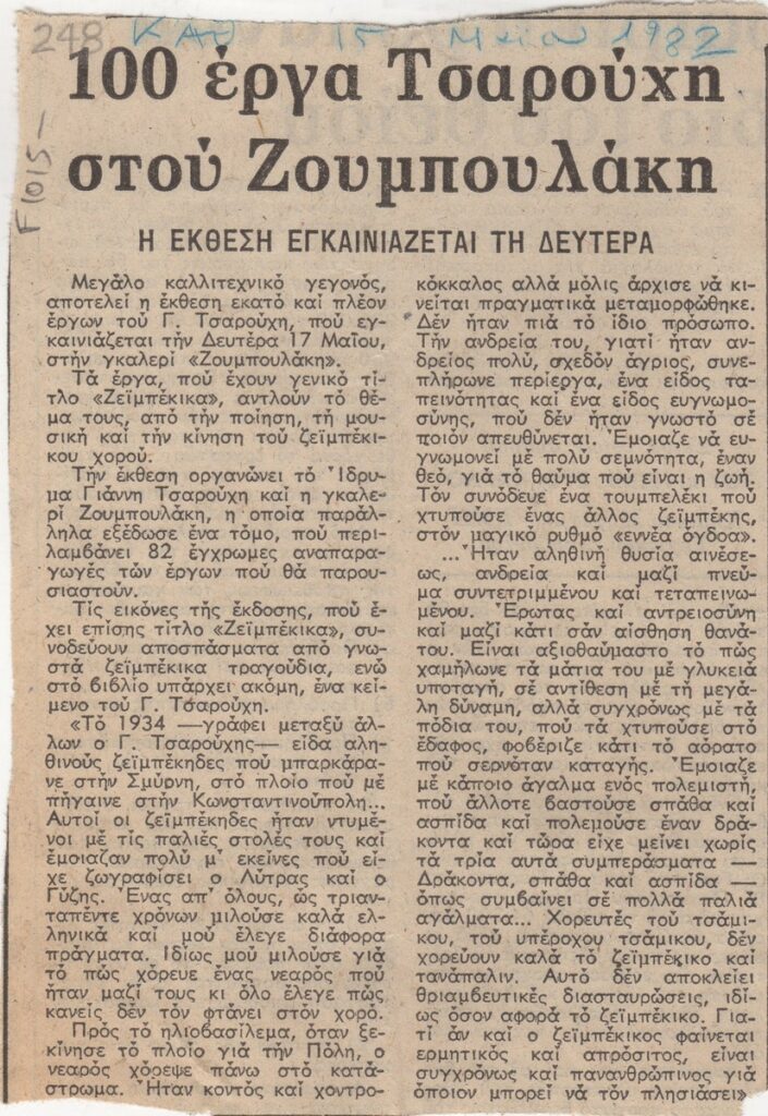 A clipping from the newspaper “I Kathimerini”, dated May 15, 1982, featuring an article about the vernissage of an exhbition by Yannis Tsarouchis at the Zoumboulakis Gallery in Athens. The artist will present a series of works on the theme of the “Zeibekiko” dance.