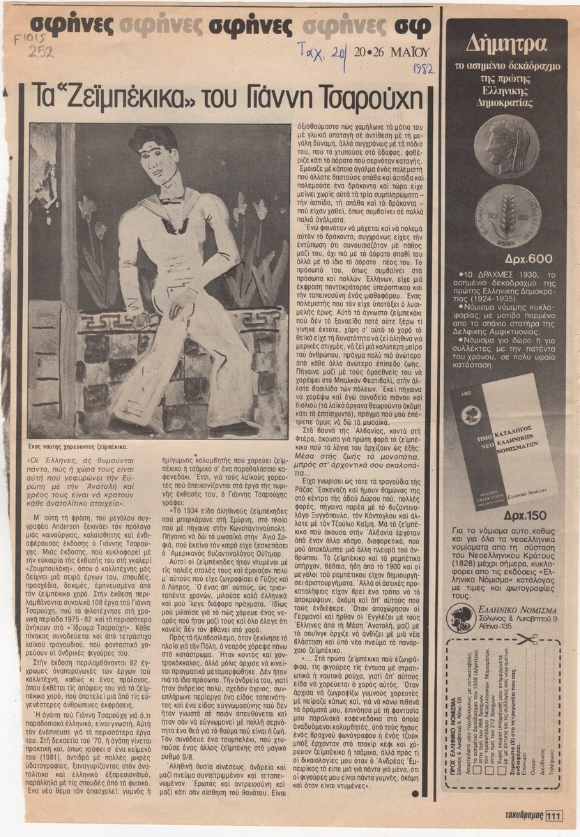 A clipping from the magazine “O Taxydromos”, dated May 20, 1982, featuring a review of the exhibition by Yannis Tsarouchis on the subject of the “Zeibekiko” dance, at the Zoumboulakis Gallery in Athens. The article also discusses the edition featuring reproductions of the artist’s works.