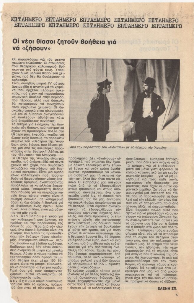 A clipping from the magazine “Athinorama”, dated May 22, 1982, featuring an article about the financial problem of theater companies in Athens, with a focus on the “Theatre of Spring”