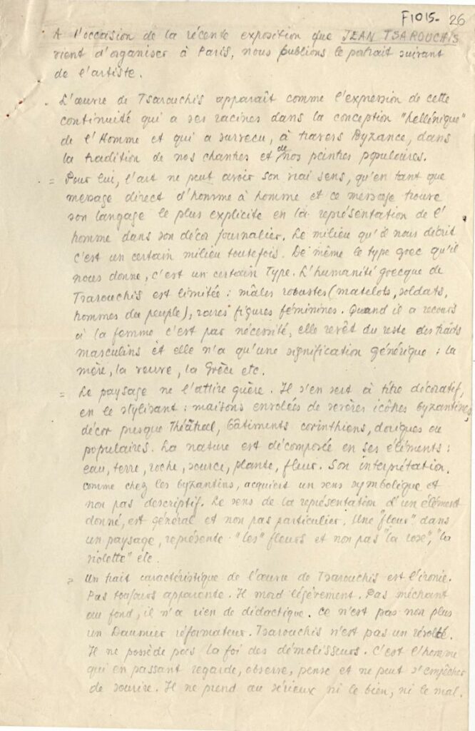 A manuscript by Tonis Spiteris for Yannis Tsarouchis, written on the occasion of the artist’s exhibition in Paris. The manuscript includes a sketch of the artist’s portrait.