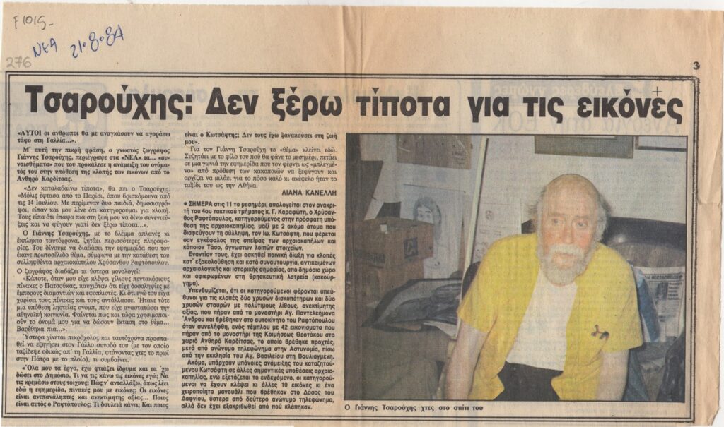 A clipping from the newspaper “Ta Nea”, dated August 21, 1984, featuring an article describing the feelings of Yannis Tsarouchis following an accusation of his alleged involvement in the theft of a Byzantine icon from a church in Anthiros near Karditsa