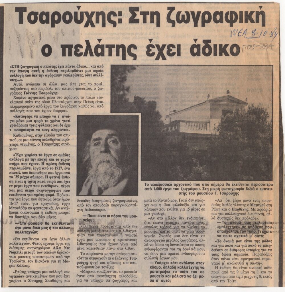 A clipping from the newspaper “Ta Nea”, dated October 8, 1984, featuring an interview with Yannis Tsarouchis, on the occasion of the inauguration of his Museum. The artist refers to his works and offers information about the venue