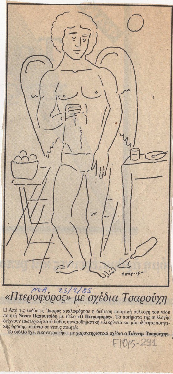A clipping from the newspaper “Ta Nea”, dated February 25, 1985, featuring an article about the release of a poetry collection by Nikos Papoutsidis titled “O Pterophoros’, published by “Ikaros’ publications, which was illustrated by Yannis Tsarouchis