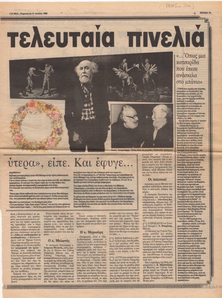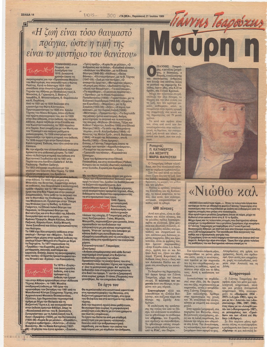 A clipping from the newspaper “Ta Nea”, dated July 21, 1989, featuring a tribute to the painter Yannis Tsarouchis on the occasion of his passing. His visual and overall contributions to the arts are discussed, along with a biographical note and statements from prominent individuals about his death.
