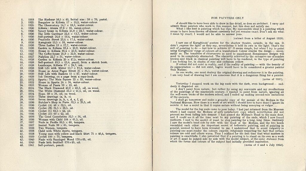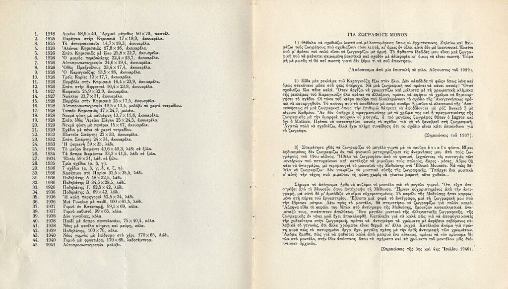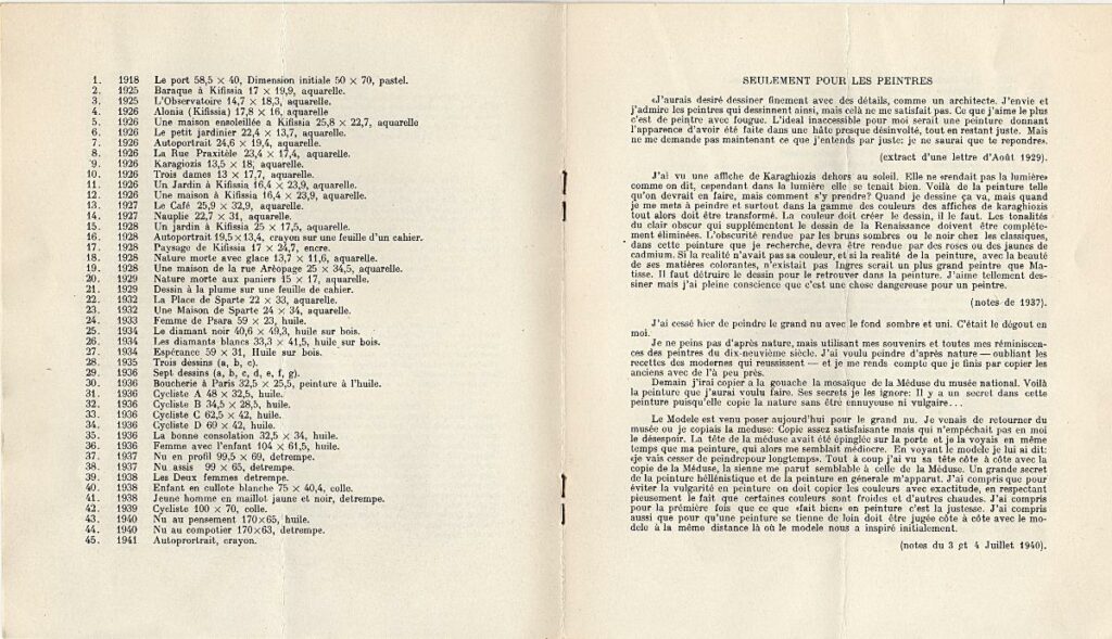 Pamplet for a retrospective exhibition of Yannis Tsarouchis at the “Astor” Gallery in Athens. It contains a list of the exhibited artworks and excerpts from the artist’s notes and a letter titled “For Painters Only.”