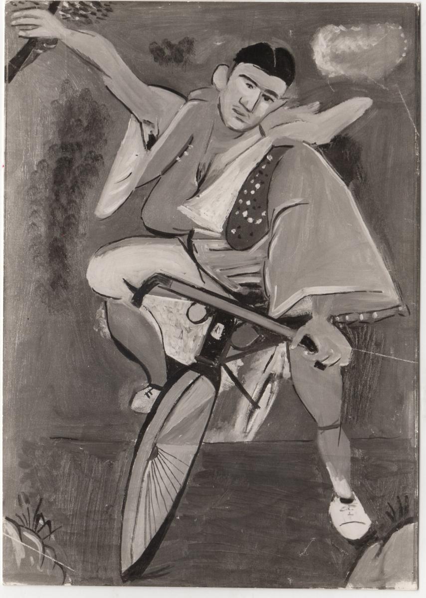A black-and-white printed photograph of an artwork by Yannis Tsarouchis. On the reverse, handwritten insciption.