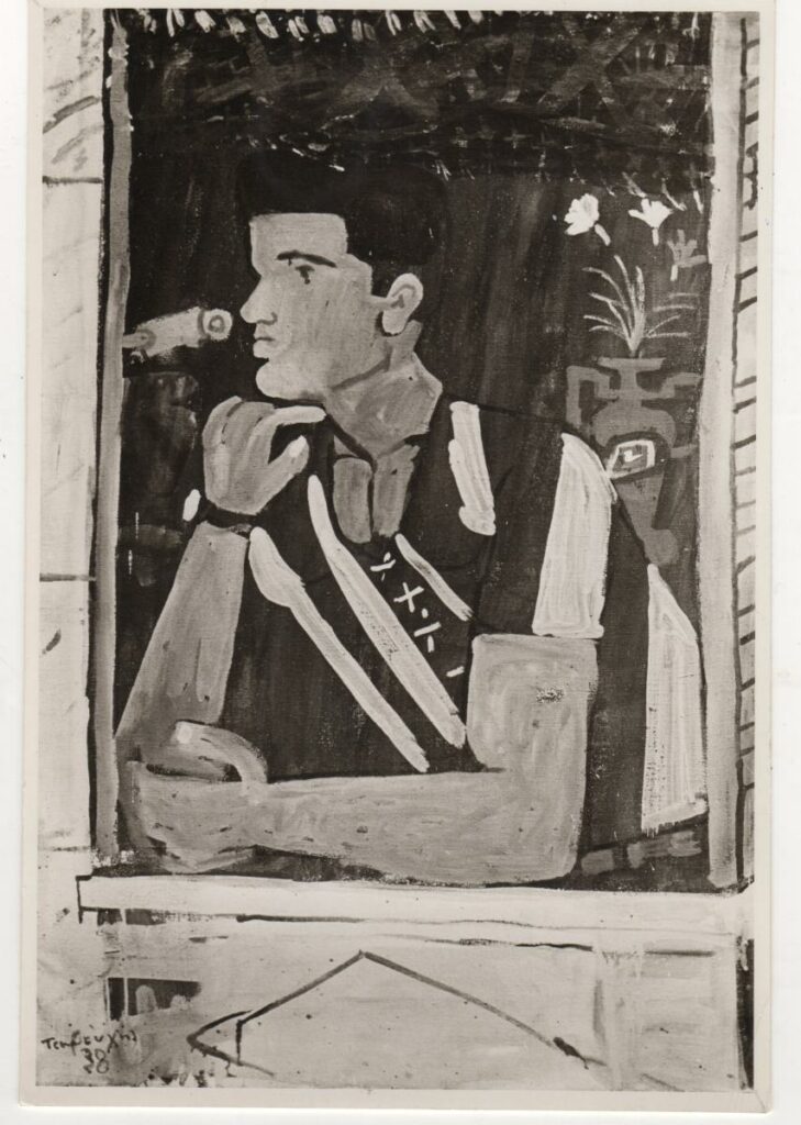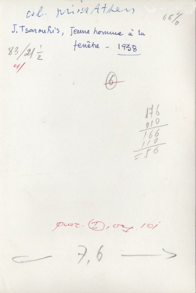 A black-and-white printed photograph of an artwork by Yannis Tsarouchis. On the reverse, handwritten insciption.