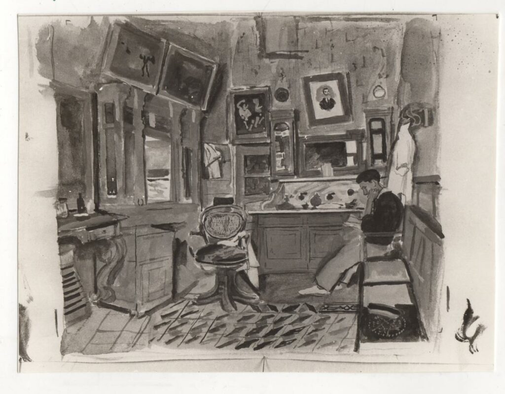 A black-and-white printed photograph of an artwork by Yannis Tsarouchis. On the reverse, handwritten insciption.