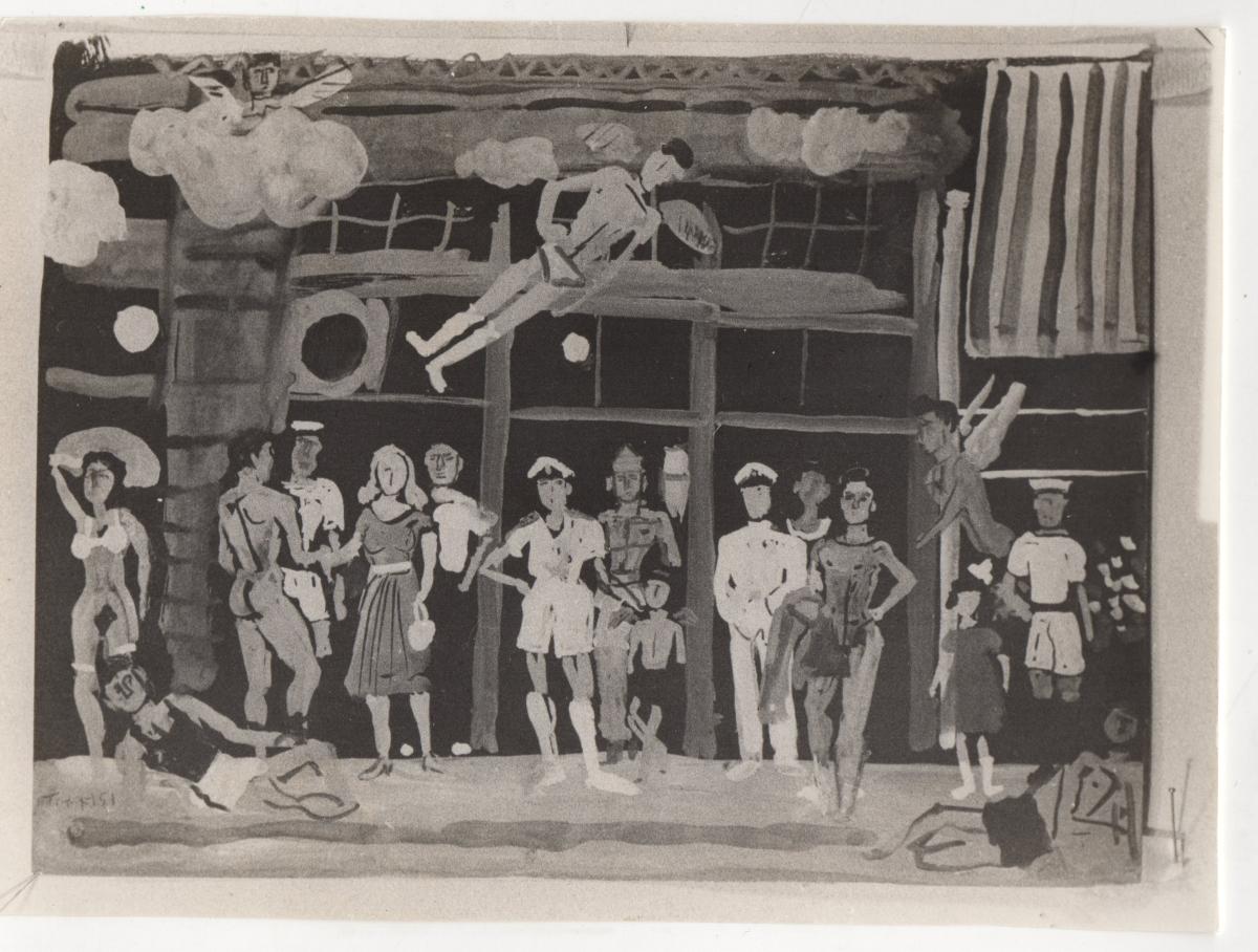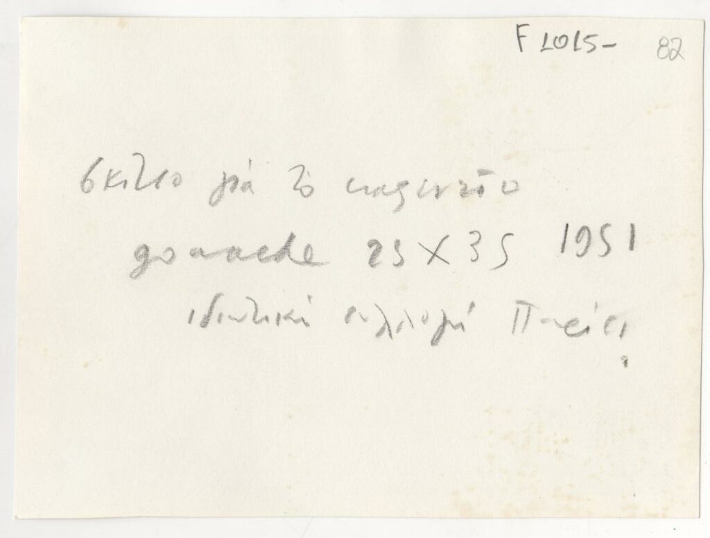 A black-and-white printed photograph of an artwork by Yannis Tsarouchis. On the reverse, handwritten insciption.