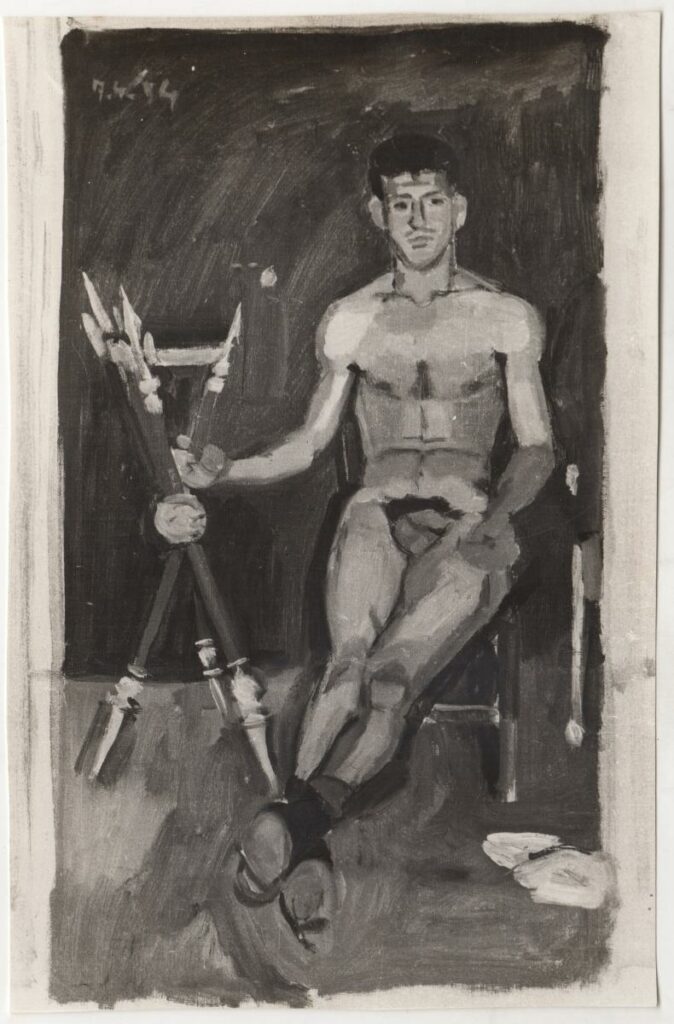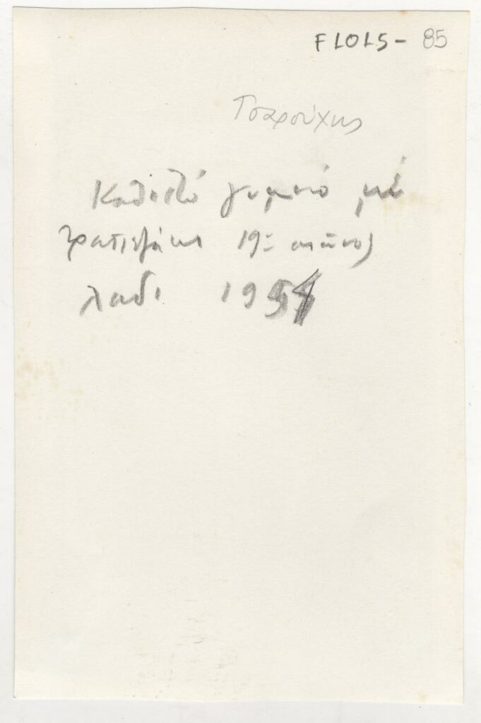 A black-and-white printed photograph of an artwork by Yannis Tsarouchis. On the reverse, handwritten insciption.