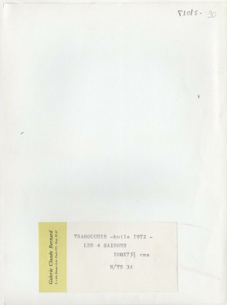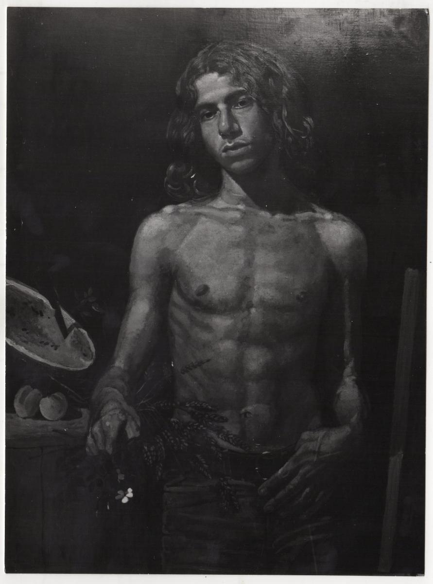 A black-and-white printed photograph of an artwork by Yannis Tsarouchis. On the reverse, handwritten insciption.