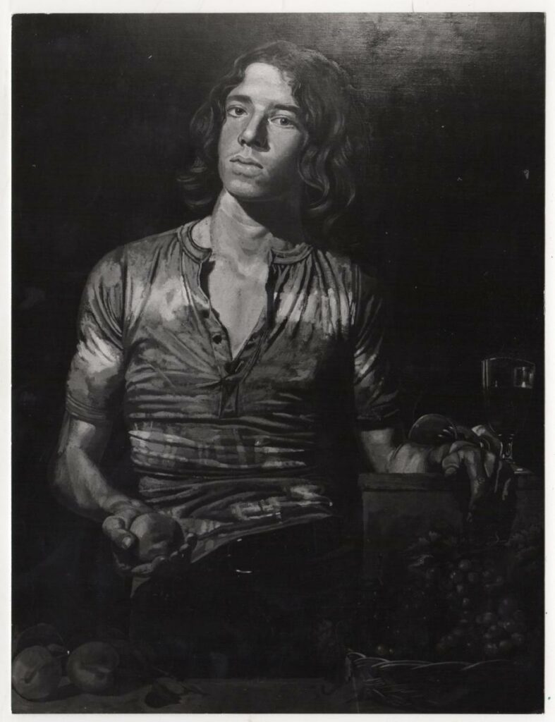 A black-and-white printed photograph of an artwork by Yannis Tsarouchis. On the reverse, handwritten insciption.