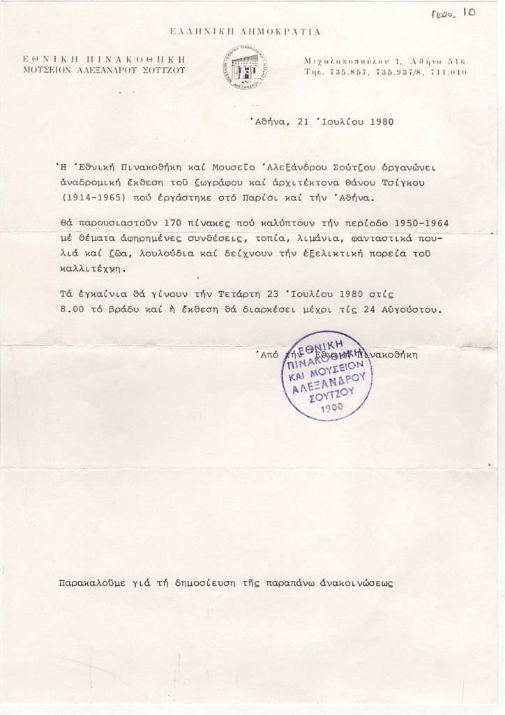 Nikos Engonopoulos (1907 - 1985) ; Vassiliou Spyros (1902 - 1985) ; Hatzikyriakos-Ghika Nikos (1906 - 1994) ; Moralis Yannis (1916 - 2009) ; Thanos Tsingos (1914 - 1965) ; Spyropoulos Yannis (1912 - 1990) ; Tsarouchis Yannis (1910 - 1989) ; Tsoclis Costas (1930) ; Romanos Chryssa (1931 - 2006) ; Απόστολος Πετρίδης ; Gaitis Yannis (1923 - 1984) ; Mytaras Dimitris (1934 - 2017) ; Psychopedis Yannis (1945) ; Costas Evangelatos (1957) ; Kanakakis Lefteris (1934 - 1985) ; Kaniaris Vlassis (1928 - 2011) ; Kessanlis Nikos (1930 - 2004) ; Malamos Kostas (1913) ; Καίτη Μεσσηνέζη-Πλατσή (1940) ; Botsoglou Chronis (1941 - 2022) ; Μιχάλης Βελουδάκης ; Όλγα Βαλιάτζα-Οικονόμου (1943) ; Φανή Μιχαηλίδου (1950) ; Θανάσης Ανδρούτσος ; Δημήτρης Καραβάκος