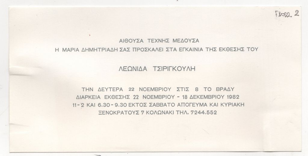 Migadis Yannis (1926 - 2017) ; Opy Zouni (1941 - 2008) ; Bouzianis Giorgos (1885 - 1959) ; Λεωνίδας Τσιριγκούλης (1937) ; Yeros Dimitris (1948) ; Πέτρος Ζουμπουλάκης (1937) ; Kyriakoulis Antonis (1938) ; Mytara Charikleia (1935) ; Χαρά Τζάνη- Ginnerup ; Βούλα Γουνελά (1951) ; Ελένη Δήμου