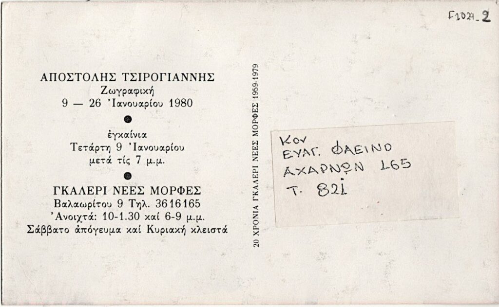 Invitation to the opening of Apostolos Tsirogiannis’ solo exhibition at the “Nees Mories’ Gallery in Athens in January 1980. On one side, a sticker with the details of Evangelos Fainos as the recipient of the invitation.