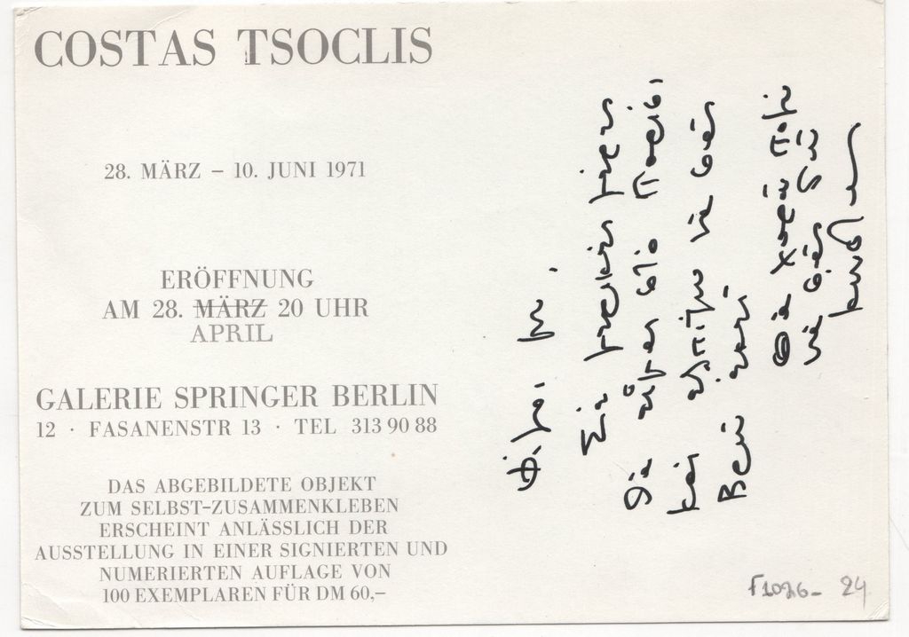 Andreou Kostas (1917 - 2007) ; Fatouros Dimitris (1928 - 2020) ; Spiteri-Veropoulou Ioanna (1920 - 2000) ; Eugène Delacroix (1798 - 1863) ; Touyas Giorgos (1922 - 1994) ; Simossi Gabriela (1926 - 1999) ; Tsoclis Costas (1930) ; Sklavos Yerassimos (1927 - 1967) ; Άγγελος Αγγελόπουλος (1904 - 1995) ; Kontopoulos Alekos (1904 - 1975) ; Mylonas Alex (1923 - 2016) ; Vyzantios Ntikos (1924 - 2007) ; Berto Lardera ; Valsamis Kostas (1908 - 2003) ; Gaitis Yannis (1923 - 1984) ; Le Corbusier (1887 - 1965) ; Georges Mathieu (1921 - 2012) ; Theodoros (Papadimitriou) (1931 - 2018) ; Takis (Vassilakis Panayiotis) (1925 - 2019) ; Victor Vasarely ; Philolaos (Tloupas) (1923 - 2010) ; Kessanlis Nikos (1930 - 2004) ; Kriezi Tita (1930 - 2021) ; Lyberaki Aglaia (1923 - 1985) ; Maltezos Yannis (1915 - 1987) ; Molfesis Iasson (1925 - 2009) ; Paniaras Kostas (1934 - 2014) ; Karras Kostas (1936 - 2012) ; Γιώργος Βαφειάδης