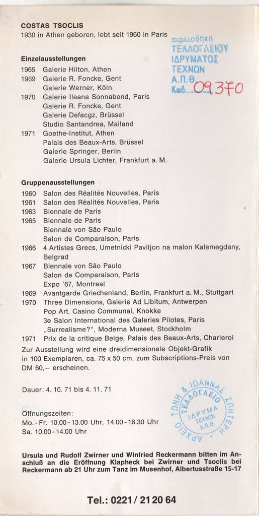 Spiteris Tonis (1910 - 1986) ; Katraki Vaso (1914 - 1988) ; Spiteri-Veropoulou Ioanna (1920 - 2000) ; José Pierre ; Michalis Katzourakis ; Fassianos Alekos (1935 - 2022) ; Simossi Gabriela (1926 - 1999) ; Tsoclis Costas (1930) ; Opy Zouni (1941 - 2008) ; Gaitis Yannis (1923 - 1984) ; Mytaras Dimitris (1934 - 2017) ; Karas Christos (1930 - 2023) ; Denis Schneider ; Vernadaki Eleni (1933) ; Takis (Vassilakis Panayiotis) (1925 - 2019) ; Sperantzas Vassilis (1938) ; Alexis Akrithakis (1939 - 1994) ; Achilleas Droungas (1940) ; Theofylaktopoulos Makis (1939 - 2023) ; Kaniaris Vlassis (1928 - 2011) ; Karavouzis Sarantis (1938 - 2011) ; Θεόδωρος Μανωλίδης (1940)