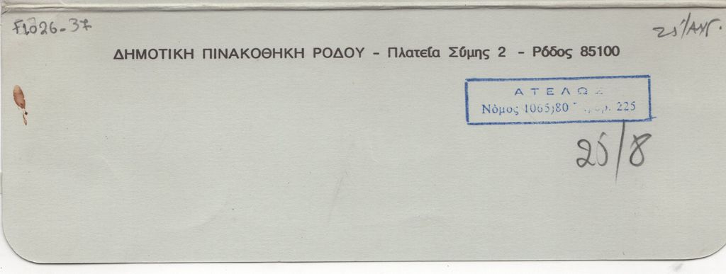 Andreou Kostas (1917 - 2007) ; Fatouros Dimitris (1928 - 2020) ; Spiteri-Veropoulou Ioanna (1920 - 2000) ; Eugène Delacroix (1798 - 1863) ; Touyas Giorgos (1922 - 1994) ; Simossi Gabriela (1926 - 1999) ; Tsoclis Costas (1930) ; Sklavos Yerassimos (1927 - 1967) ; Άγγελος Αγγελόπουλος (1904 - 1995) ; Kontopoulos Alekos (1904 - 1975) ; Mylonas Alex (1923 - 2016) ; Vyzantios Ntikos (1924 - 2007) ; Berto Lardera ; Valsamis Kostas (1908 - 2003) ; Gaitis Yannis (1923 - 1984) ; Le Corbusier (1887 - 1965) ; Georges Mathieu (1921 - 2012) ; Theodoros (Papadimitriou) (1931 - 2018) ; Takis (Vassilakis Panayiotis) (1925 - 2019) ; Victor Vasarely ; Philolaos (Tloupas) (1923 - 2010) ; Kessanlis Nikos (1930 - 2004) ; Kriezi Tita (1930 - 2021) ; Lyberaki Aglaia (1923 - 1985) ; Maltezos Yannis (1915 - 1987) ; Molfesis Iasson (1925 - 2009) ; Paniaras Kostas (1934 - 2014) ; Karras Kostas (1936 - 2012) ; Γιώργος Βαφειάδης