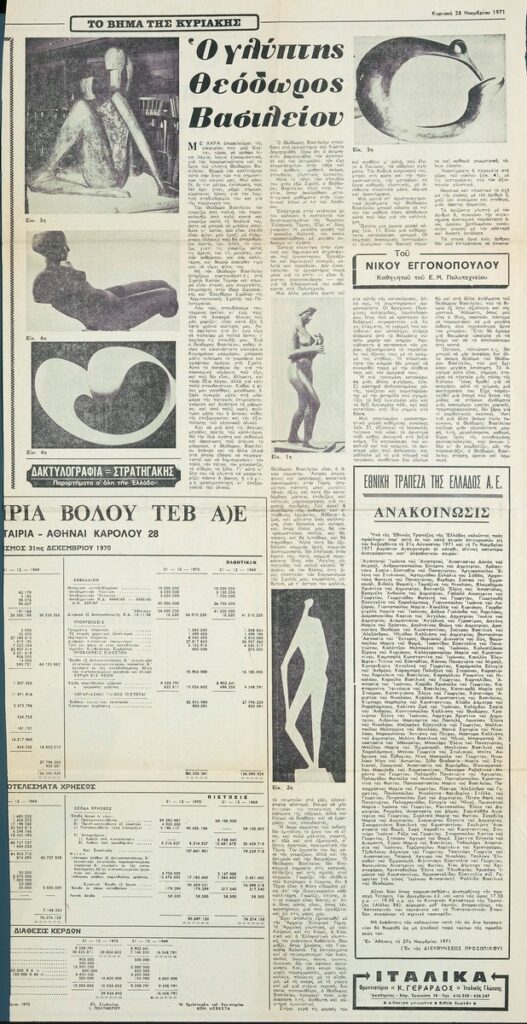A clipping from the newspaper “To Vima”, dated November 28, 1971, featuring an article by the Greek painter Nikos Engonopoulos about the work of Th. Vassiliou.