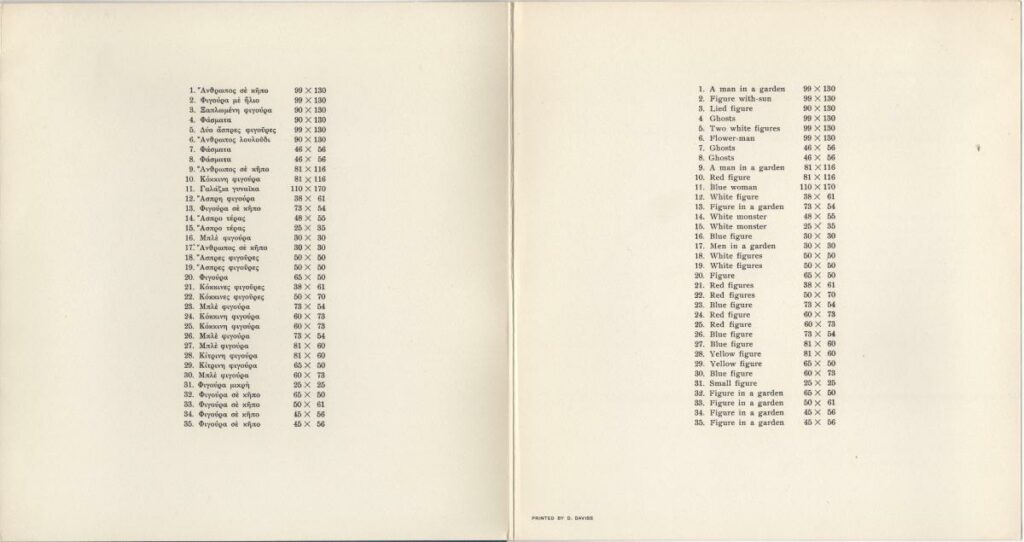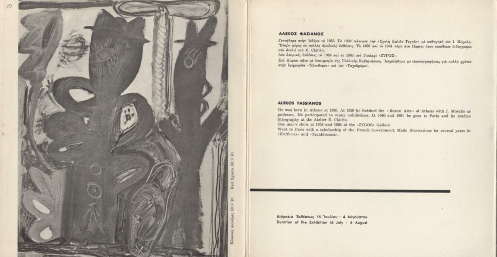 Pamphlet of an exhibition by Alekos Fassianos in Athens in the summer of 1963. It contains biographical note, list of works and illustration.