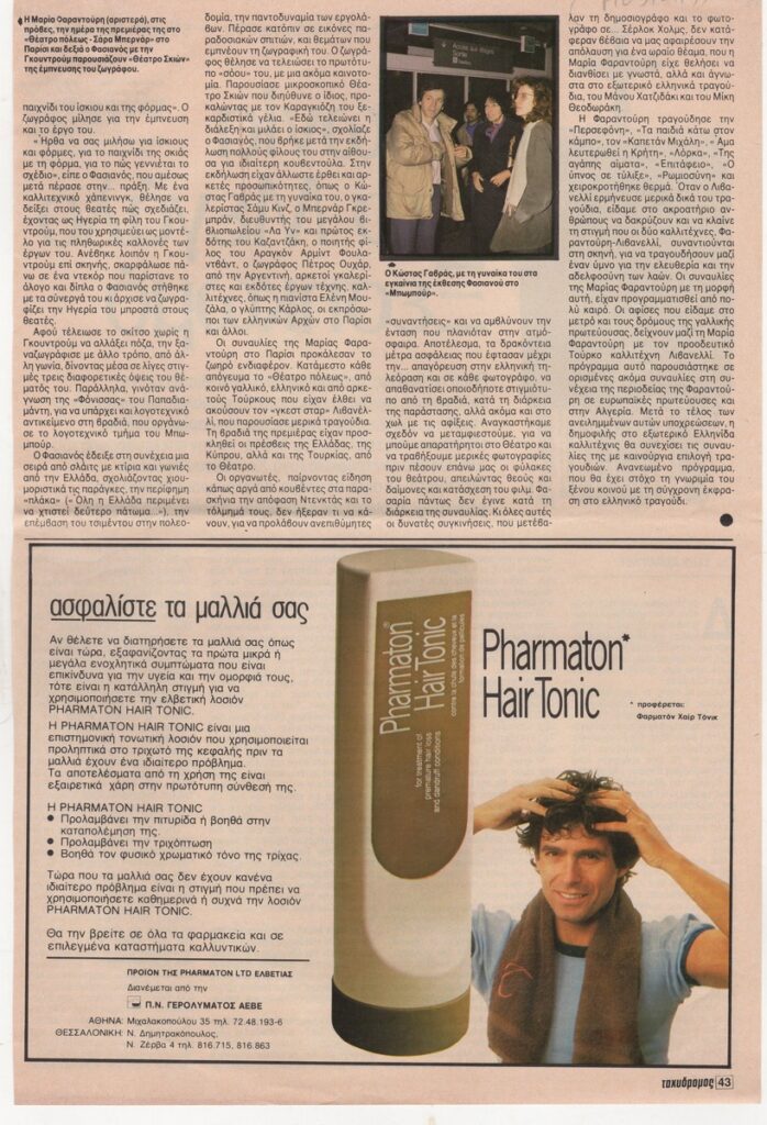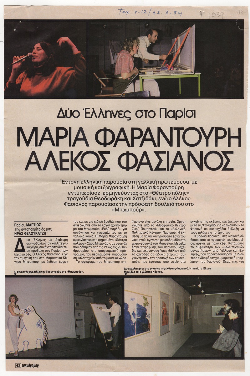 A clipping from the magazine “O Taxydromos”, issue 12, April 22, 1984, featuring an article about the exhibition by Alekos Fassianos and a concert by Maria Faradouris in Paris.