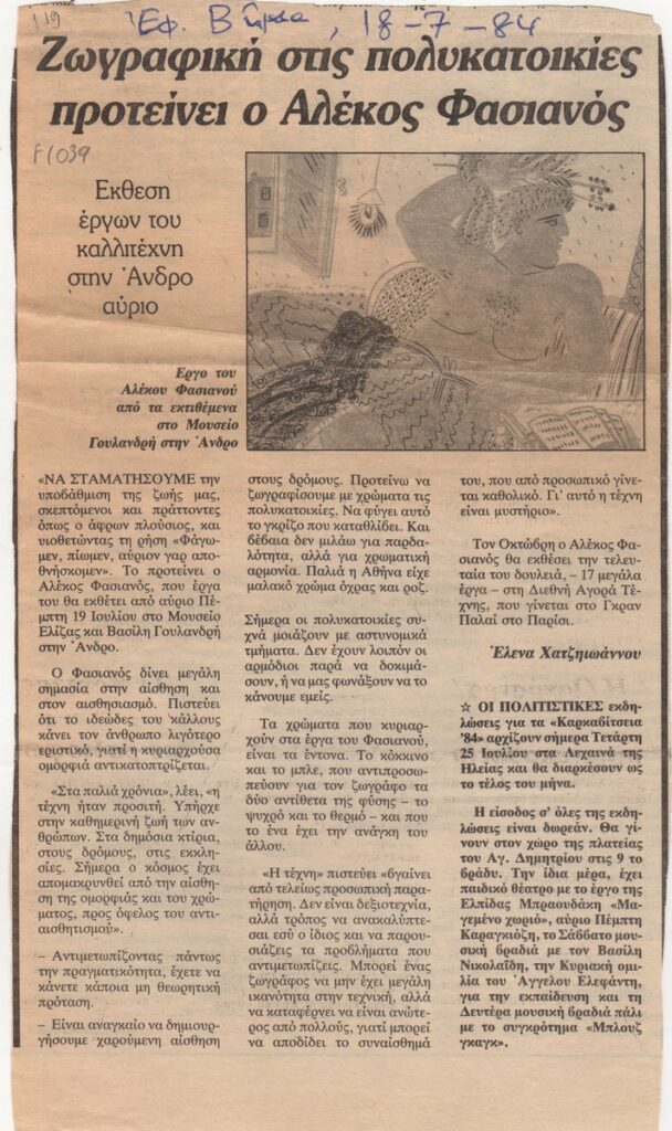 A clipping from the newspaper “To Vima”, dated July 18, 1984, featuring an article about the exhibition by Alekos Fassianos, at the Eliza and Vassilis Goulandris Museum in Andros.