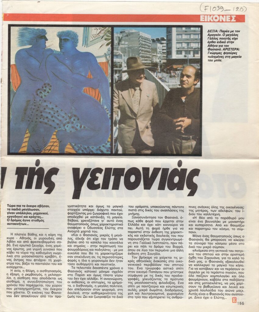A clipping from the magazine “Eikones”, dated December 5, 1984, featuring an article about the painting influences of Alekos Fassianos, with special mention of the artist’s love for the neighborhoods of Athens.