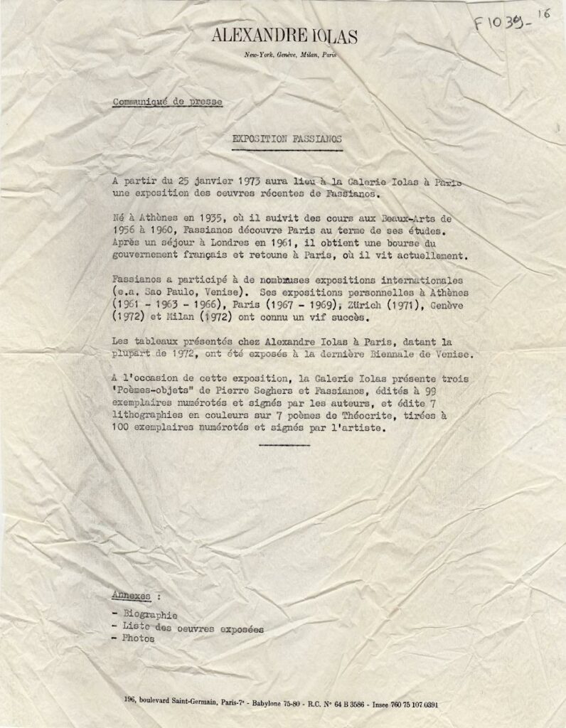 A photocopy of a press release for an exhibition by Alekos Fassianos at the Galerie Alexandre Iolas in Paris. The release includes biographical information about the artist and details about the exhibition. It also notes the release of a publication by Pierre Seghers and Fassianos, issued in conjunction with the exhibition