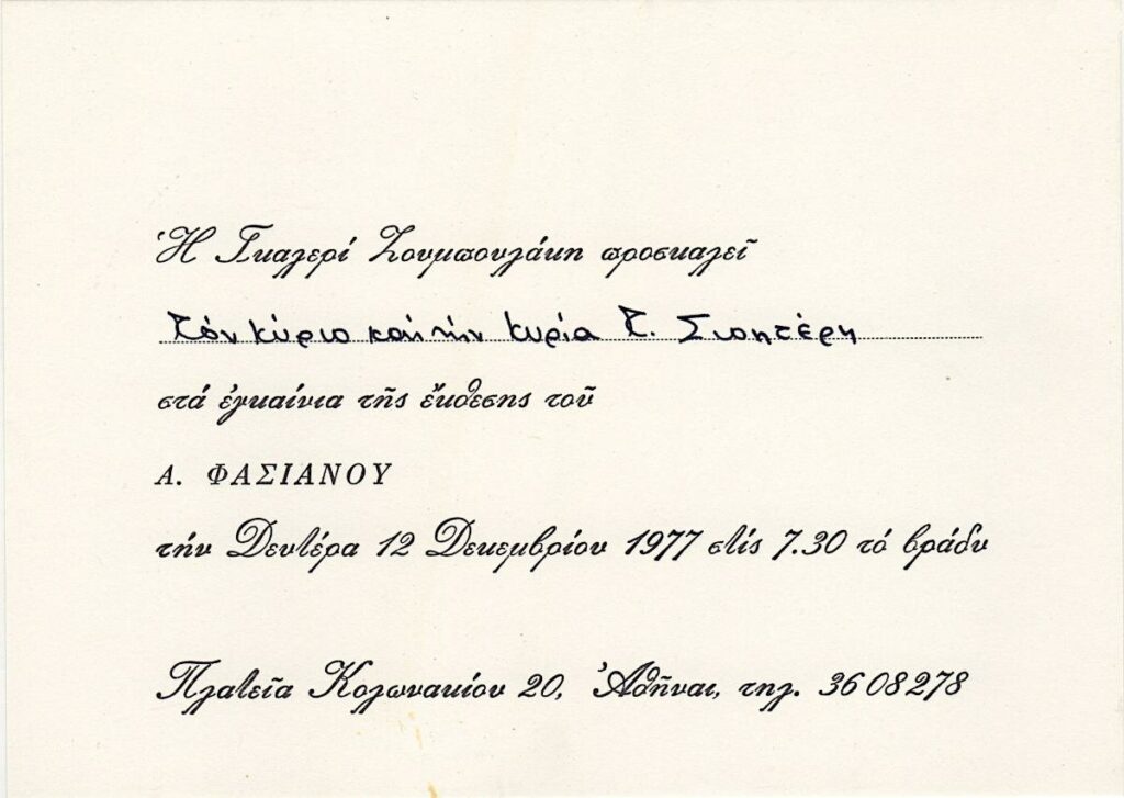 Invitation for the vernissage of an exhibition by Alekos Fassianos at the Zoumboulakis Gallery in Athens, addressed to Tonis and Ioanna Spiteris.