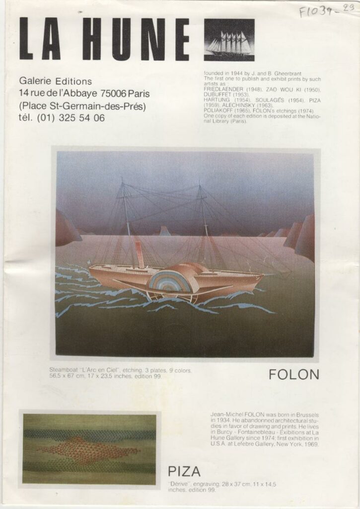 Pamphlet published by Galerie La Hune, giving biographical notes of Folon, Piza, Dorny, Fassianos and Lalanne.