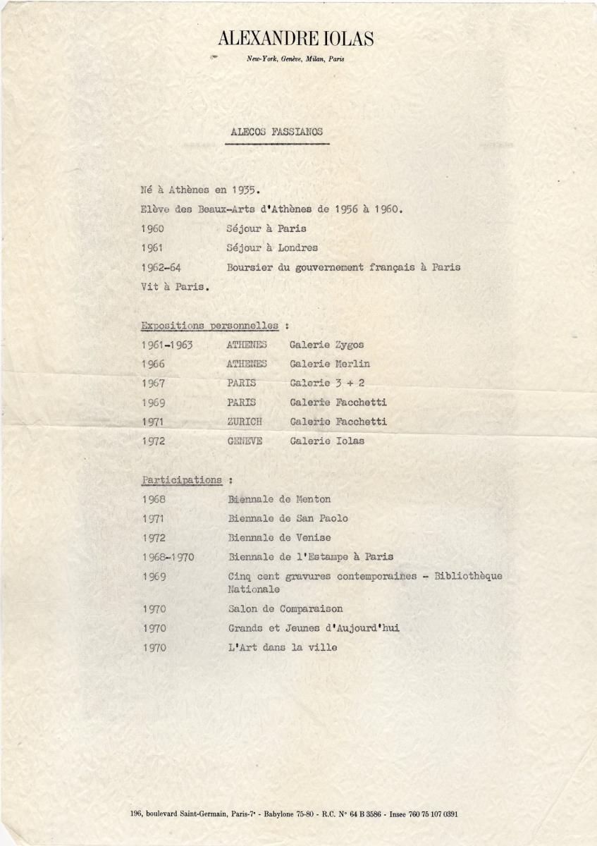 Photocopy of a biographical note of the painter Alekos Fassianos. It is probably part of the artist’s exhibition form, at the Iolas Gallery in Paris.