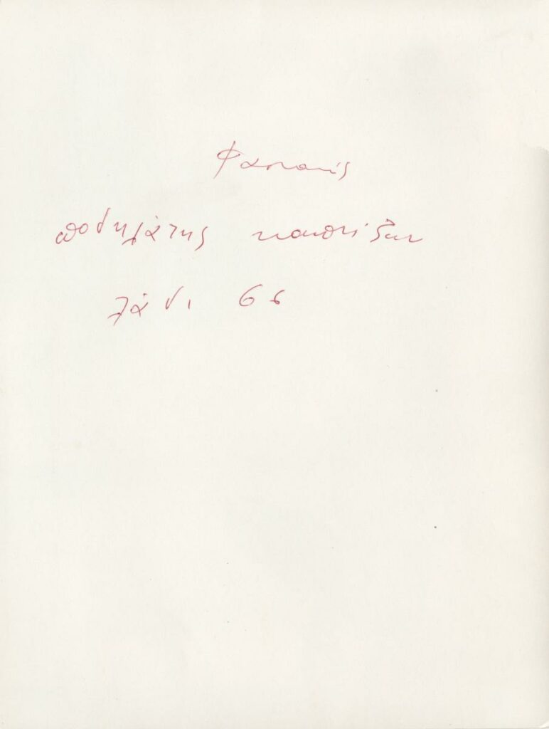 Black-and-white printed photograph of an artwork by Alecos Fassianos. On the reverse, an inscription.