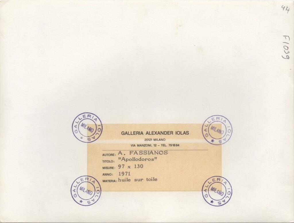 Black-and-white printed photograph of a work by Alekos Fassianos. On the reverse, a label from the Iola Gallery in Milan, with information about the work