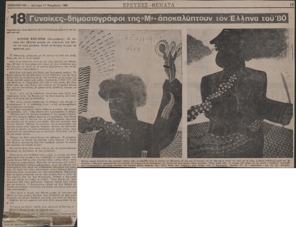 A clipping from the newspaper “Mesimvrini”, dated November 17, 1980, featuring a research with the participation of Alekos Fassianos. The artist refers to the male figures in his works and to his influences.