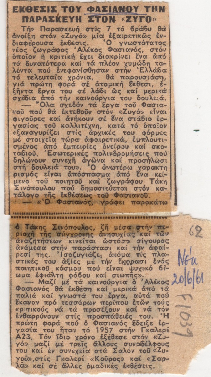 A clipping from the newspaper “Ta Nea”, dated June 20, 1961, featuring an article about the vernissage of an exhbition by Alekos Fassianos at the Zygos Gallery in Athens.