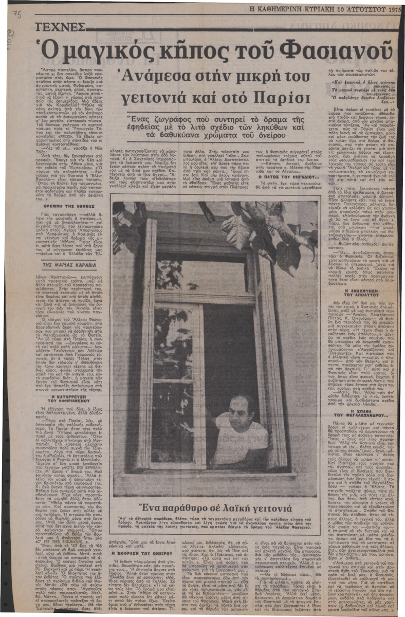 A clipping from the newspaper “I Kathimerini”, dated August 10, 1975, featuring an article about the life of Alekos Fassianos in Athens and Paris and his visual work.