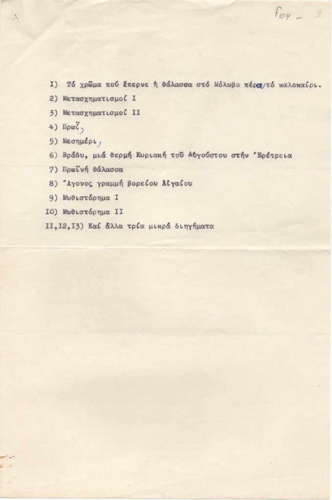 Engonopoulos Nikos (1907 - 1985) ; Spiteri-Veropoulou Ioanna (1920 - 2000) ; Vassiliou Spyros (1902 - 1985) ; Aperghis Achilleas (1909 - 1986) ; Gaitis Yannis (1923 - 1984) ; Gravalos Panayiotis (1933 - 2015) ; Grammatopoulos Konstantinos (1916 - 2003) ; Varlamos Giorgos (1922 - 2013) ; Katsoulidis Takis (1933) ; Μάριος Λοβέρδος ; Malamos Kostas (1913) ; Manousakis Giorgos (1914 - 2003) ; Georgios Mavroidis (1912 - 2003) ; Malamou-Mitsea Ioanna (1913 - 2004) ; Drakouli Iris (1929)