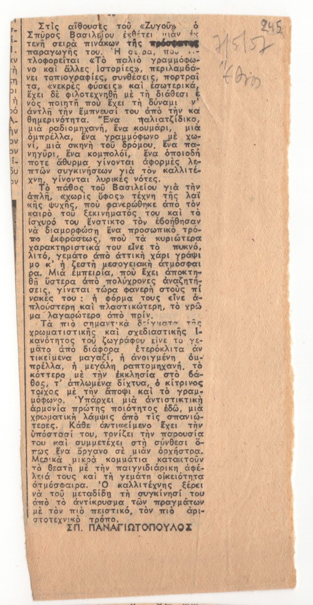 A clipping from the newspaper “To Ethnos’, dated May 7, 1957, featuring a review of the artist’s exhibition in Athens at the “Zygos” Gallery.