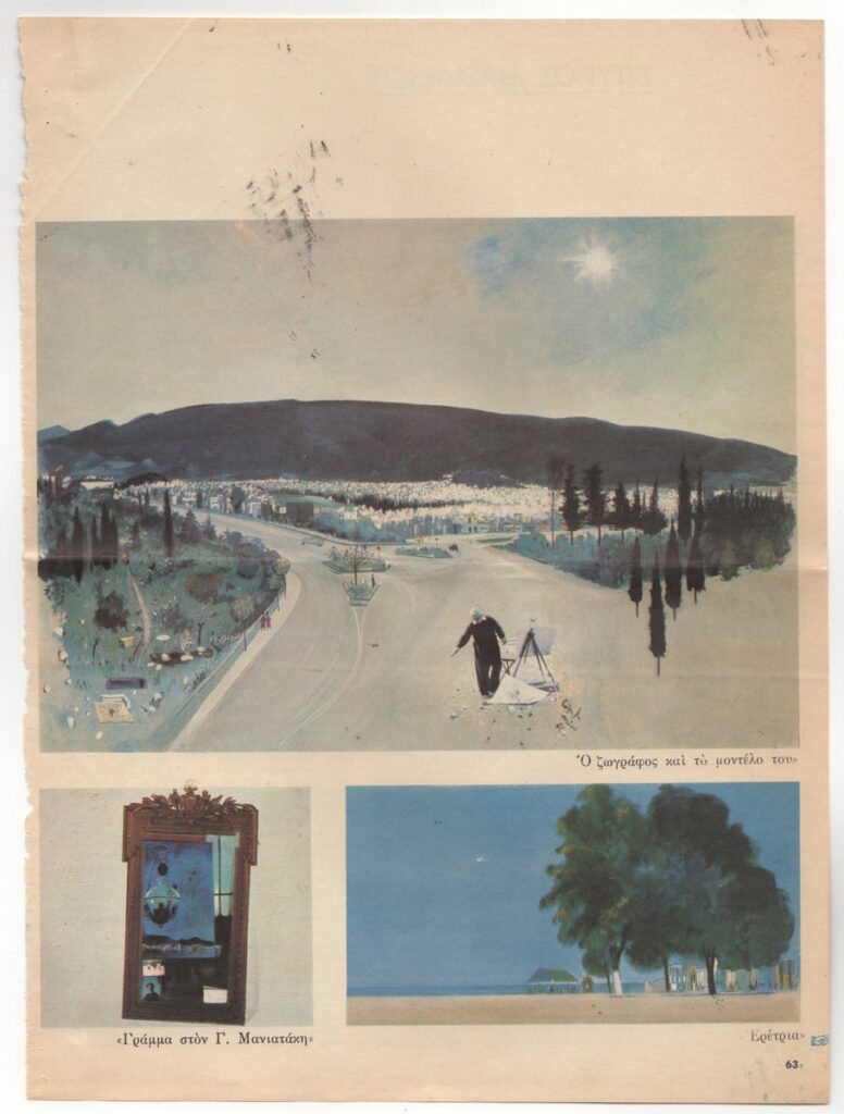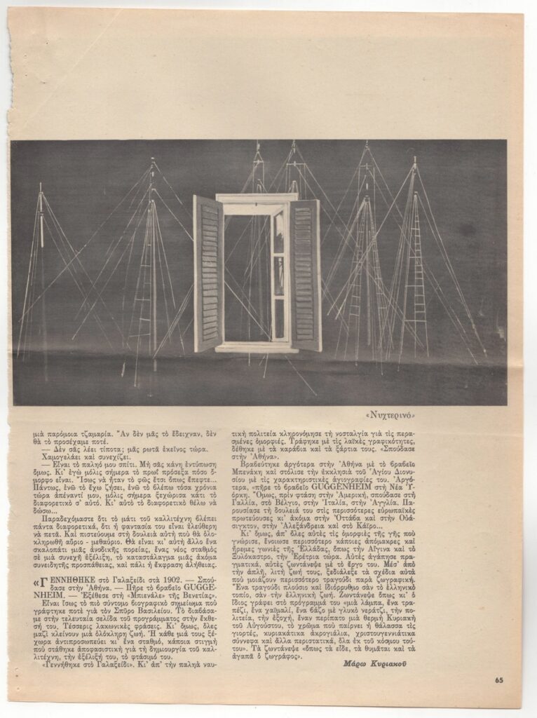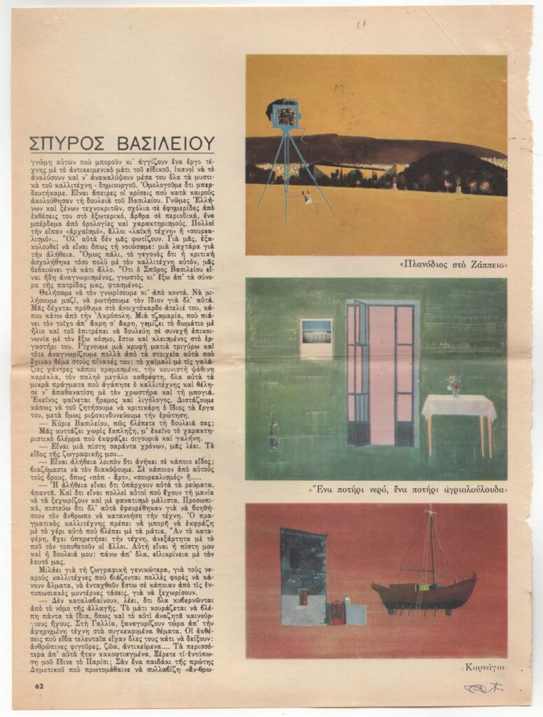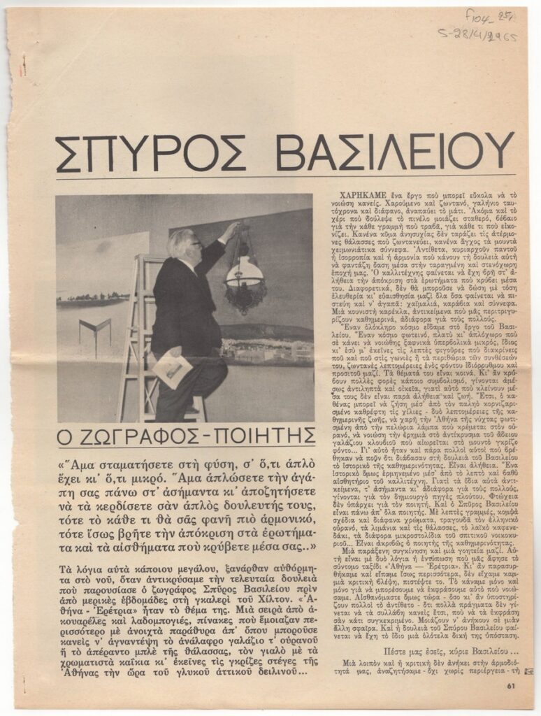 A magazine clipping dated April 28, 1965, featuring an interview of the artist on the occasion of his exhibition at the “Hilton” Gallery in Athens.