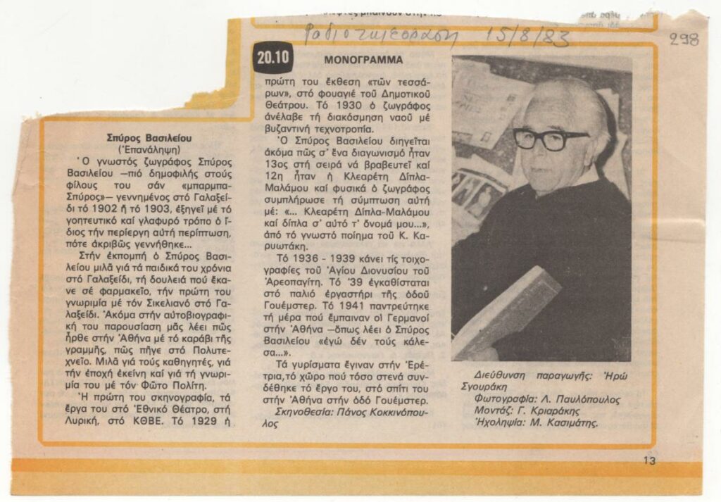Nikos Engonopoulos (1907 - 1985) ; Spiteri-Veropoulou Ioanna (1920 - 2000) ; Vassiliou Spyros (1902 - 1985) ; Achilleas Aperghis (1909 - 1986) ; Gaitis Yannis (1923 - 1984) ; Panayiotis Gravalos (1933 - 2015) ; Konstantinos Grammatopoulos (1916 - 2003) ; Varlamos Giorgos (1922 - 2013) ; Katsoulidis Takis (1933) ; Μάριος Λοβέρδος ; Malamos Kostas (1913) ; Manousakis Giorgos (1914 - 2003) ; Georgios Mavroidis (1912 - 2003) ; Malamou-Mitsea Ioanna (1913 - 2004) ; Iris Drakouli (1929)