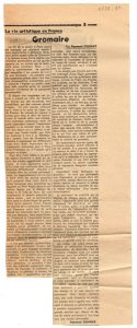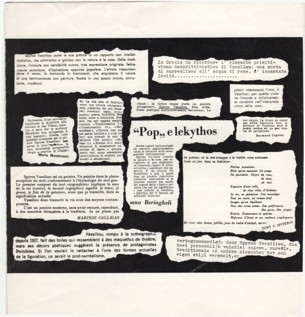 Pamphlet which contains artist biographical note, text by L. Finer,with photographs of works, and a collage of foreign press clippings about the artist. Handwritten dedication of the artist.