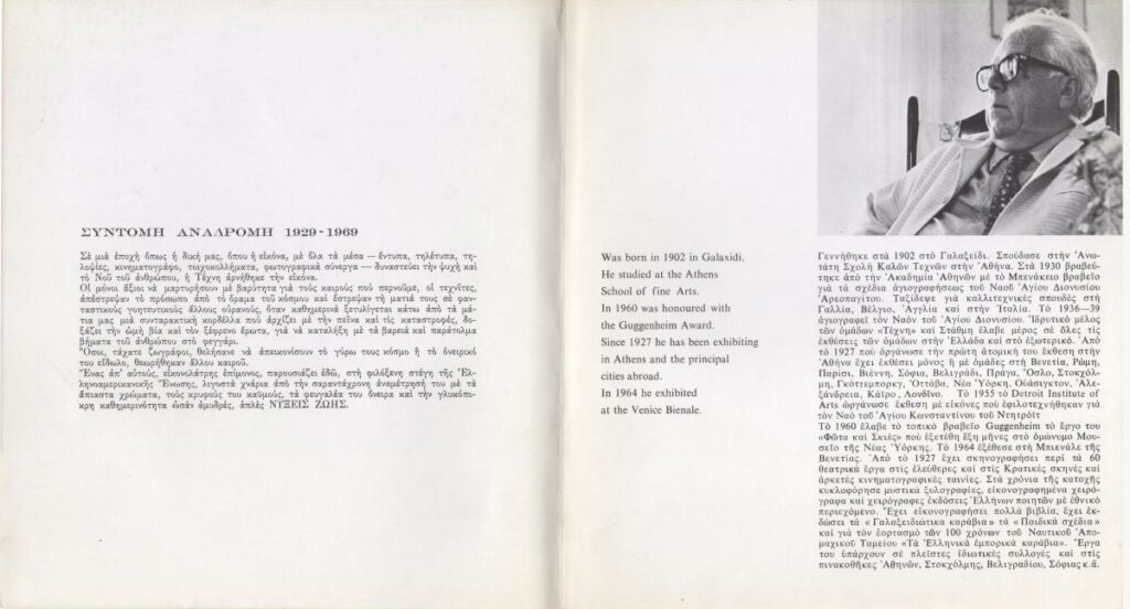 Pamphlet for the exhibition by Spyros Vassiliou. It contains introductory text, short artist bio, photographe of an artwork on cover and photo of artist inside, and clipping collage with clippings of foreign press reviews.