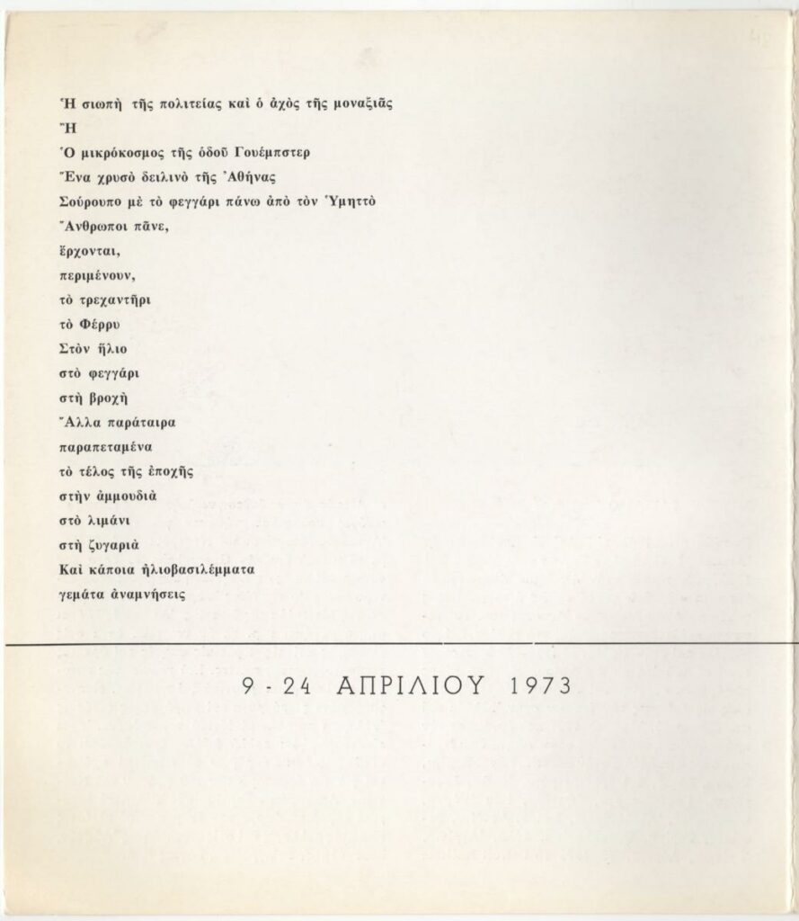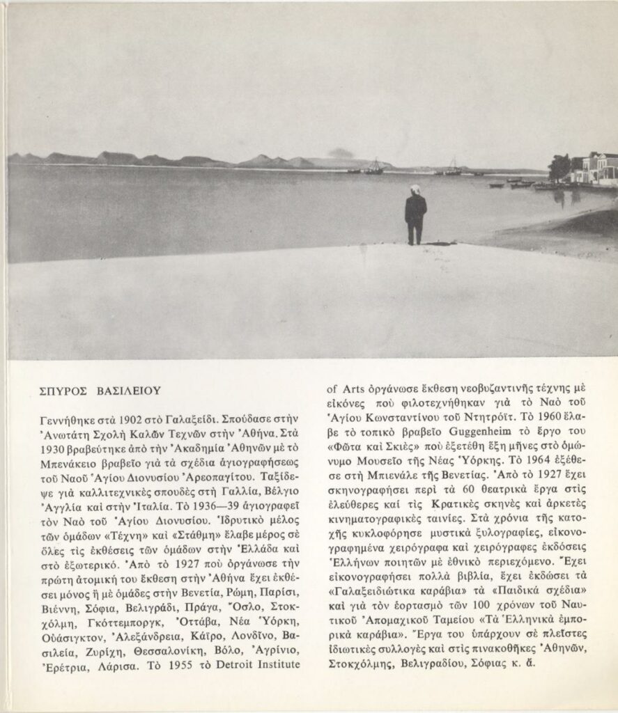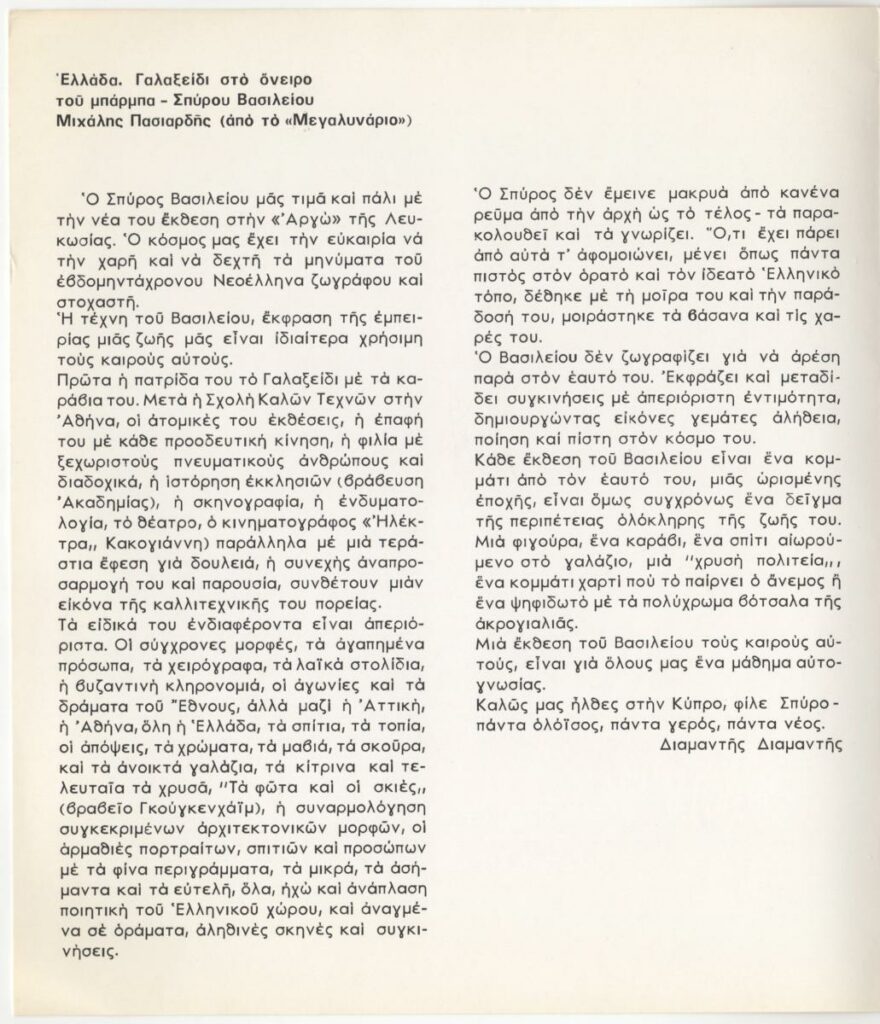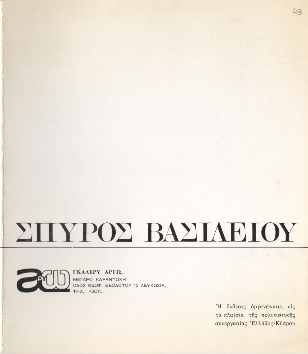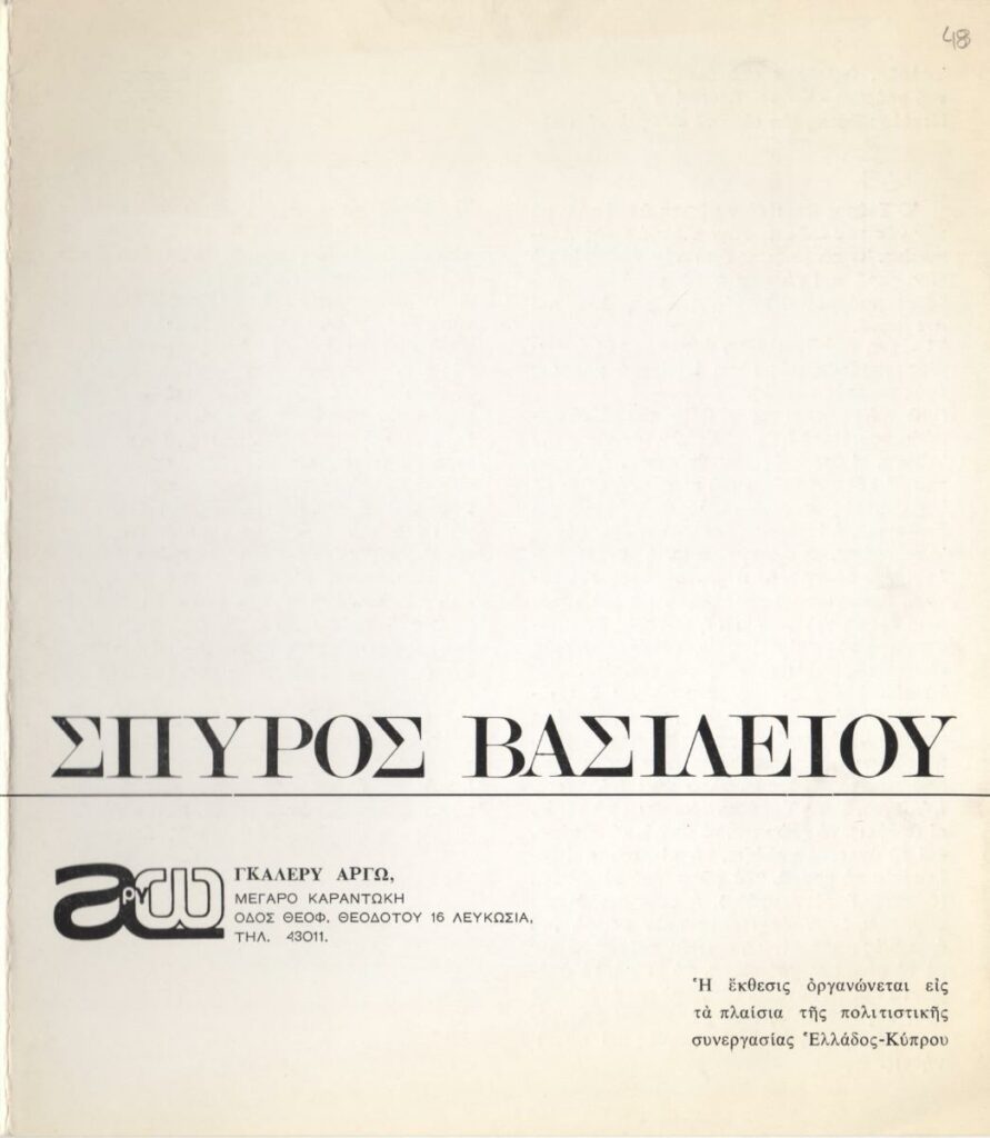 Pamphlet for the exhibition by Spyros Vassiliou at the “Argo” Gallery in Nicosia. It contains a text by the Cypriot painter Adamantios Diamantis and quote from a poem by M. Passiardis from the play “Megalynario”.