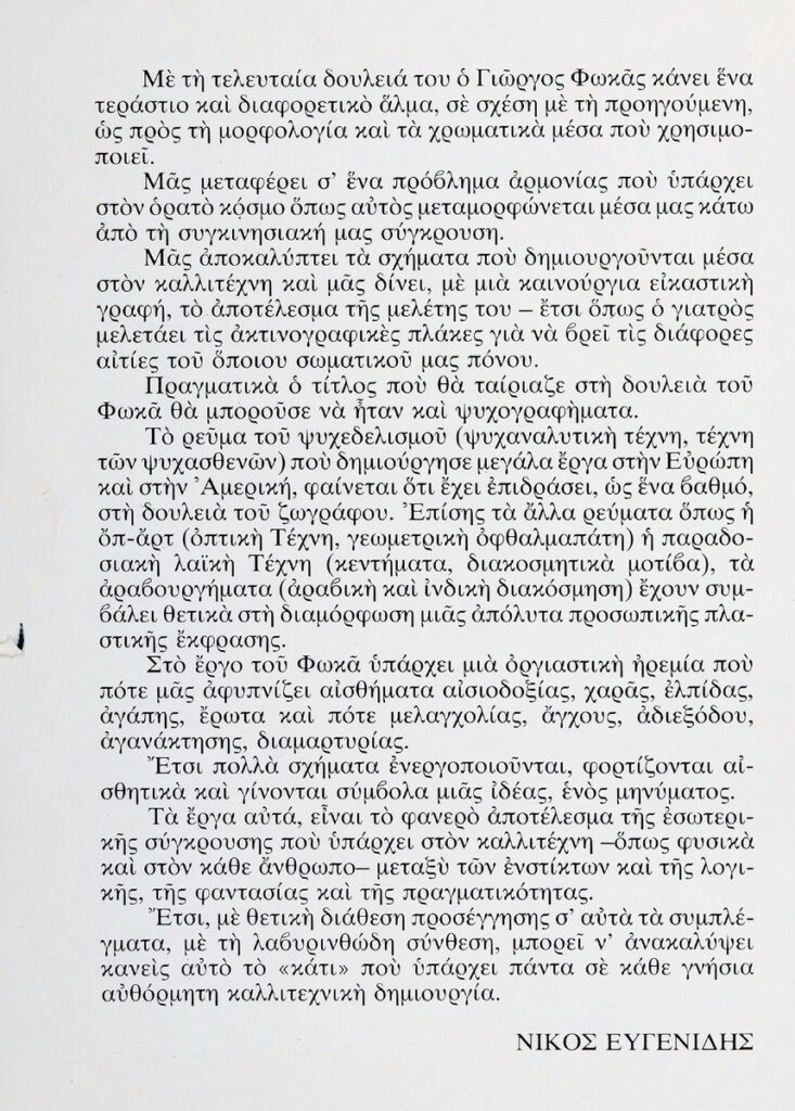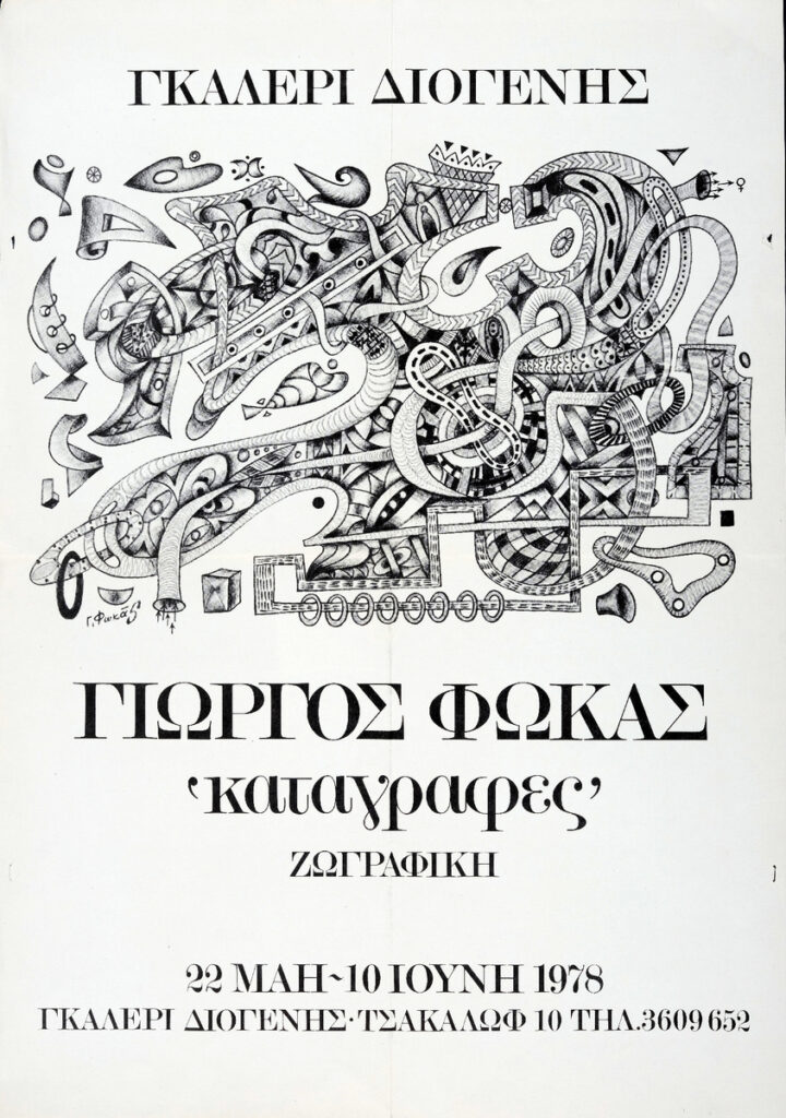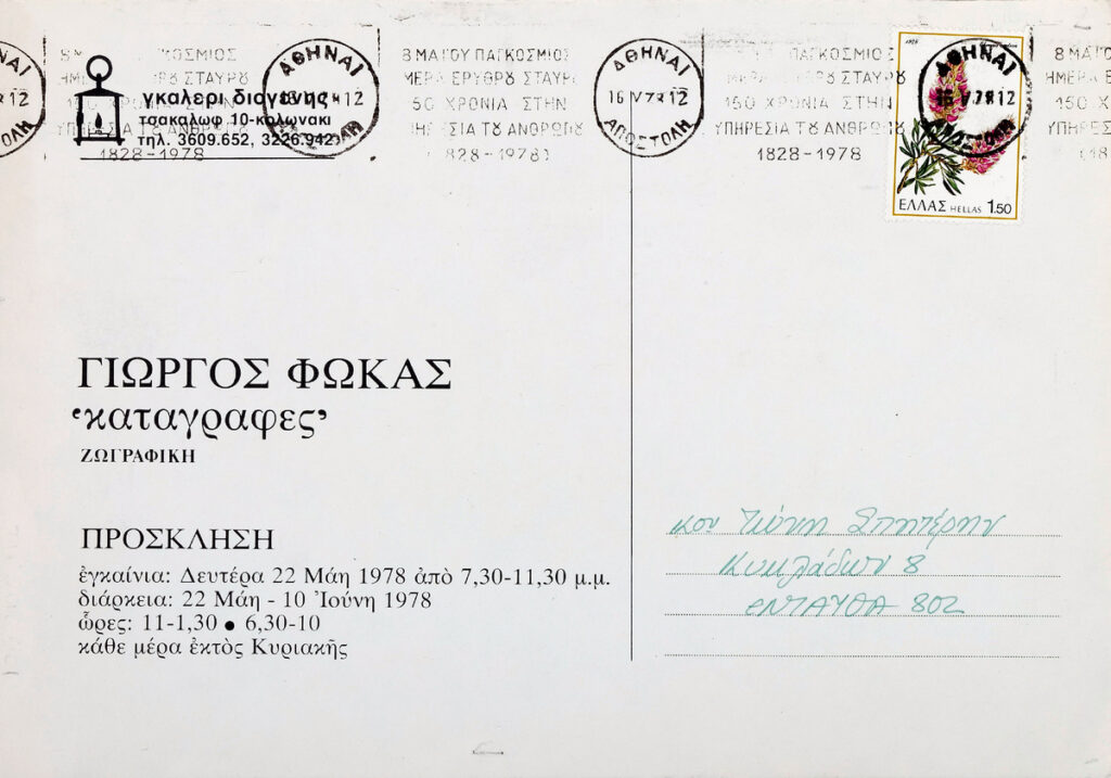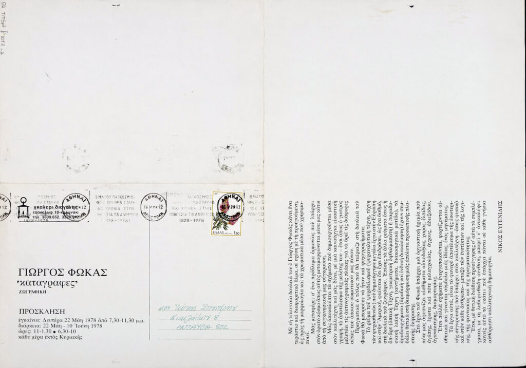 Poster for the solo exhibition by Giorgos Fokas at the “Diogenes” Gallery in Athens, addessed to the art critic Tonis Spiteris.