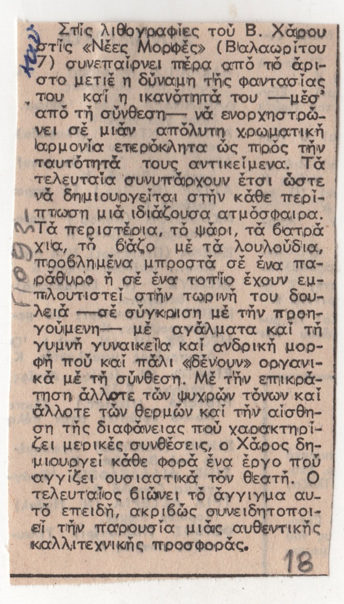 Katraki Vaso (1914 - 1988) ; Δανιήλ Δανιήλ (1914 - 1988) ; Charos Vassilis (1938 - 2000) ; Komianou Aria (1938 - 2015) ; Christakopoulos Marinos (1946) ; Roubina Sarelakou (1950) ; Tetsis Panagiotis (1925 - 2016) ; Nella Golanta (1941 - 2023) ; Achilleas Droungas (1940) ; Katsoulidis Takis (1933) ; Milios Giorgos (1935 - 2021) ; Bouteas Yannis (1941 - 2026) ; Maria Ziaka (1948) ; Xenaki Ariadne (1924 - 2015) ; Piladakis Manolis (1927) ; Ελένη Παπαδάκη ; Kazakos Kostas (29/05/1935) ; Mia Perivola (1942) ; Markaki Jenny (1939) ; Πίτσα Μαύρου-Μπρέμπου (1940 - 1984)