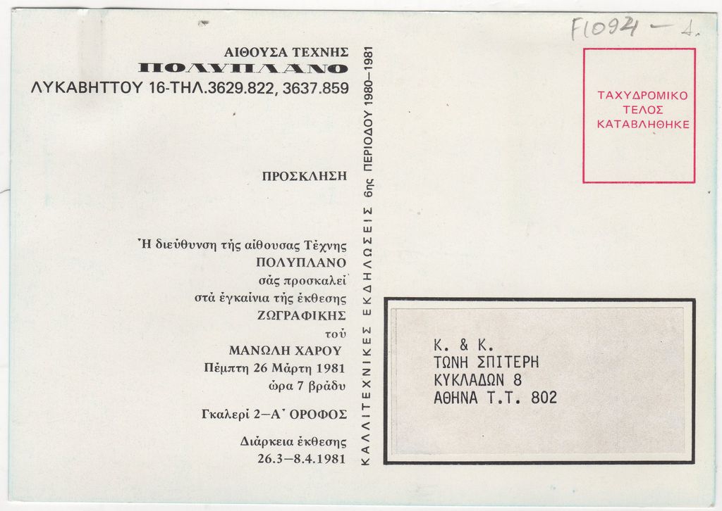 Andreou Kostas (1917 - 2007) ; Fatouros Dimitris (1928 - 2020) ; Spiteri-Veropoulou Ioanna (1920 - 2000) ; Eugène Delacroix (1798 - 1863) ; Giorgos Touyas (1922 - 1994) ; Simossi Gabriela (1926 - 1999) ; Tsoclis Costas (1930) ; Sklavos Yerassimos (1927 - 1967) ; Άγγελος Αγγελόπουλος (1904 - 1995) ; Kontopoulos Alekos (1904 - 1975) ; Mylonas Alex (1923 - 2016) ; Vyzantios Ntikos (1924 - 2007) ; Berto Lardera ; Valsamis Kostas (1908 - 2003) ; Gaitis Yannis (1923 - 1984) ; Le Corbusier (1887 - 1965) ; Georges Mathieu (1921 - 2012) ; Theodoros (Papadimitriou) (1931 - 2018) ; Takis (Vassilakis Panayiotis) (1925 - 2019) ; Victor Vasarely ; Philolaos (Tloupas) (1923 - 2010) ; Kessanlis Nikos (1930 - 2004) ; Kriezi Tita (1930 - 2021) ; Lyberaki Aglaia (1923 - 1985) ; Maltezos Yannis (1915 - 1987) ; Molfesis Iasson (1925 - 2009) ; Paniaras Kostas (1934 - 2014) ; Karras Kostas (1936 - 2012) ; Γιώργος Βαφειάδης