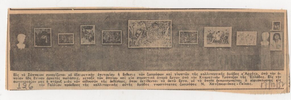 A newspaper clipping dated December 17, 1952, featuring an article about the the exhibition by the “Armos’ Group of artists at Zappeio Megaro, of which Nikos Chatzikyriakos-Gkikas is a member.