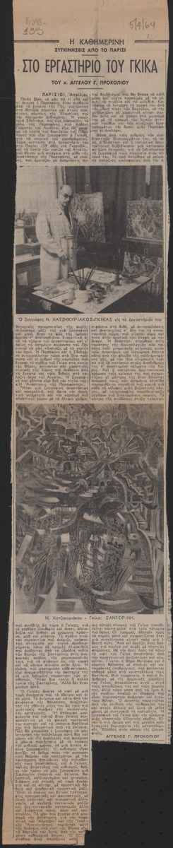 A clipping from the newspaper “I Kathimeri”, dated April 5, 1964, featuring an article about the impressions from a visit to the studio of Nikos Chatzikyriakos-Gkikas, in Paris.