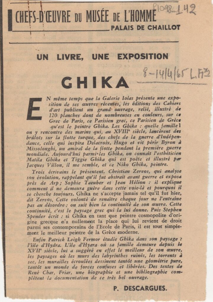 A clipping from the newspaper “Les Lettres Françaises’, dated April 8, 1965, featuring an article about the exhibition by Nikos Chatzikyriakos-Gkikas, at the “Iolas Gallery” in Paris. In the same clipping: reference to the release of a collective volume for Greece by “Cahiers d” Art” publications, which includes 120 reproductions of Gkikas’s works.